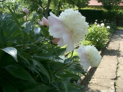 im laufe des warmen, schon sehr sommerlichen tages öffnen sich immer mehr pfingstrosen. von dieser hellen, mir unbekannten sorte gibt es allein im unteren gartenbereich bis jetzt vier große büsche. und da sich päonien in unserem garten wir unkraut vermehren, werden es wohl mit der zeit noch ein paar mehr werden.